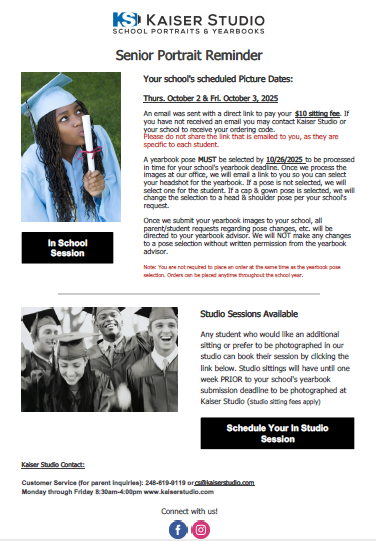 Senior Picture Day will be Thursday, October 2nd from 7:30am-9:45am (half day of school) and Friday, October 3rd 7:30am-12:45pm here at Utica in the ECC.You will need to sign up for a day and time in the main office starting Monday, September 15 through October 1st.The cost is $10.00 and will need to be paid online with the direct link that was sent to you from Kaiser Studio. We cannot take payment in the main office.This picture can be used for the school yearbook photo.